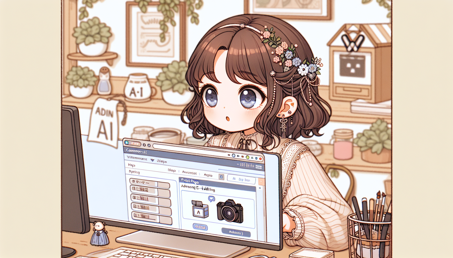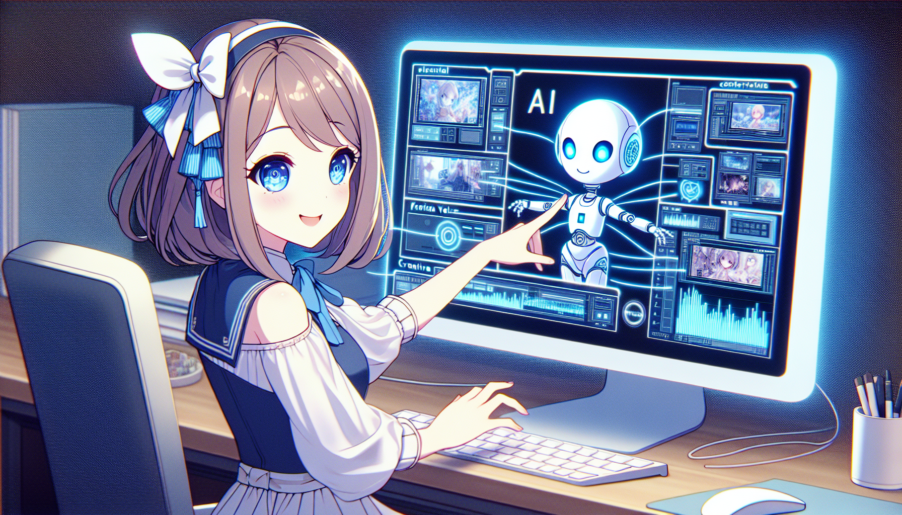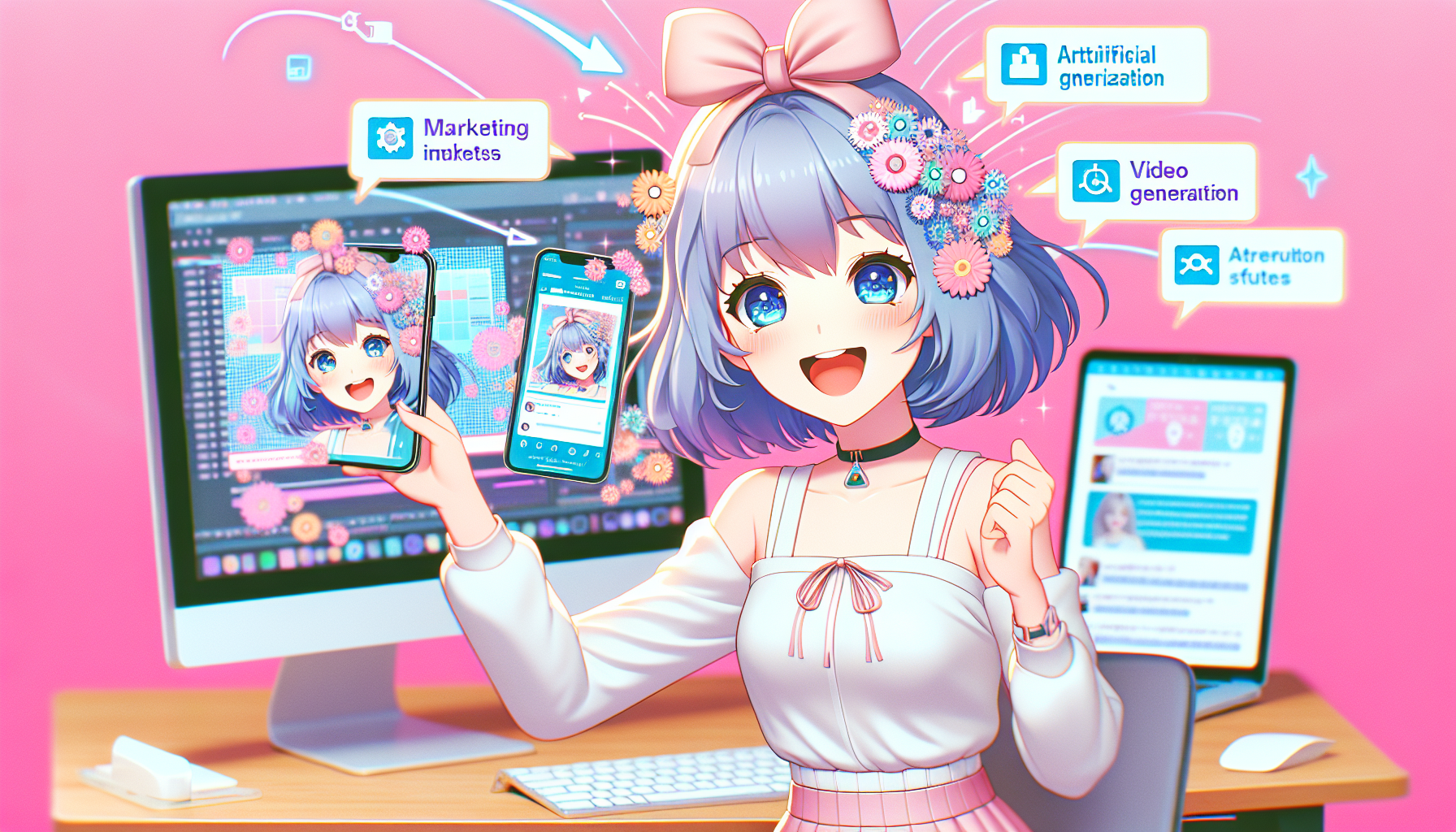 オフィスで美少女AIが商品を活用するシーンを生成。商品の実用性や効率性をアピールします。